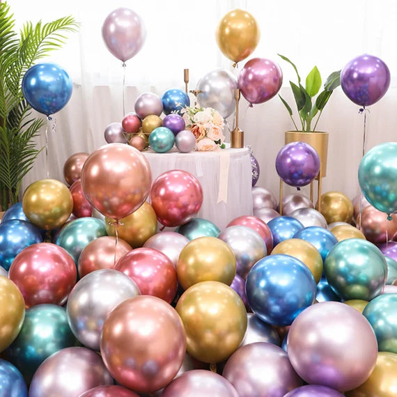 Metallic Multi Color Premium Quality Balloons Add some shine to your parties with these beautiful rich looking metallic Chrome balloons. The metallic colors of these chrome balloons give additional chrome type fresh shine to your balloon arch decoration at your events like baby shower, bridal shower, kids birthday party or any other events like that. Balloons are a basic design element on any decoration and plays a vital role in the final outlook of any event to make it memorable for life